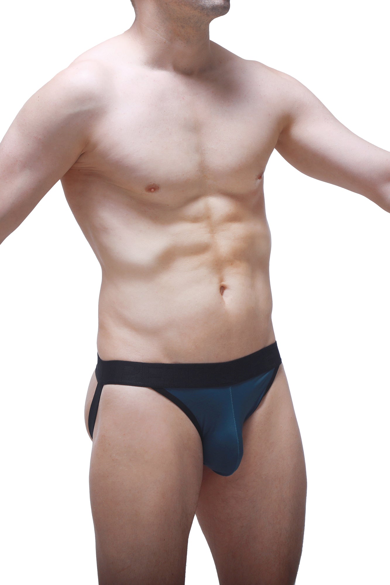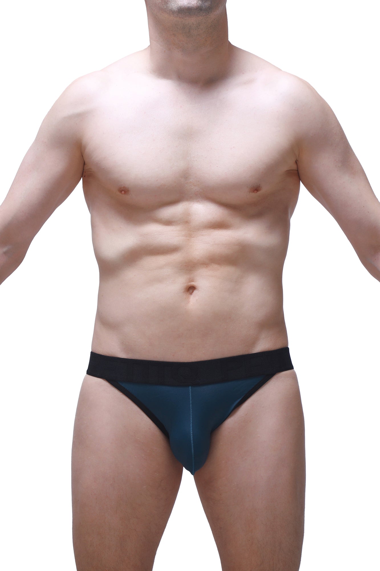 Dark blue g-string in nylon with elastics in the back like a jockstrap. Black elastics and waistband.